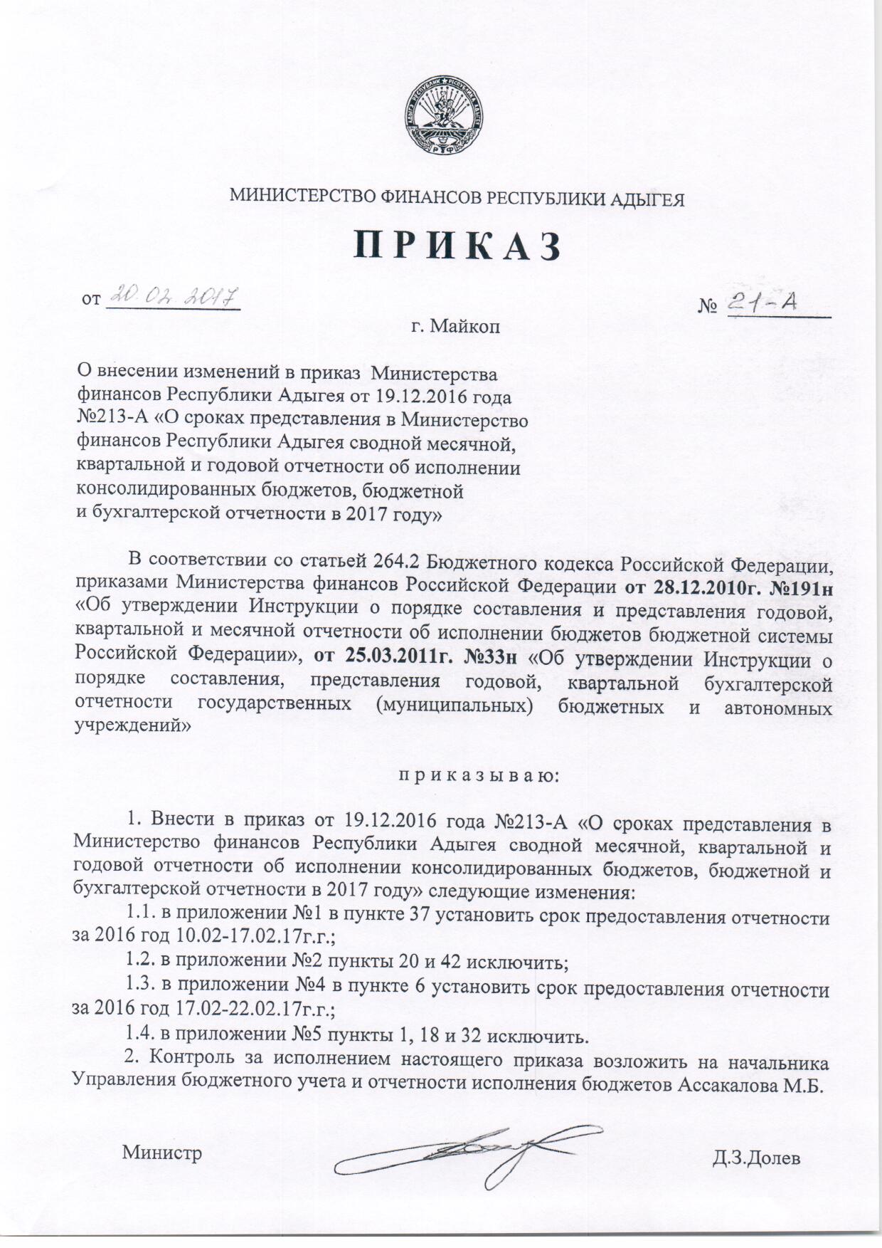 Приказ Министерства финансов Республики Адыгея от 20.02.2017 № 21-А "О внесении изменений в приказ Министерства финансов Республики Адыгея от 19.12.2016 № 213-А "О сроках представления в Министерство финансов Республики Адыгея сводной месячной, квартальной и годовой отчетности об исполнении консолидированных бюджетов, бюджетной и бухгалтерской отчетности в 2017 году"